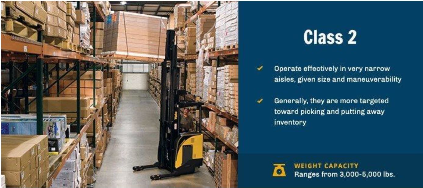 Options include side-loaders and turret trucks. Comb lift manufactures a variety of extremely versatile side loaders. Weight capacity for Class II machines generally ranges from 3,000-5,000 lbs.